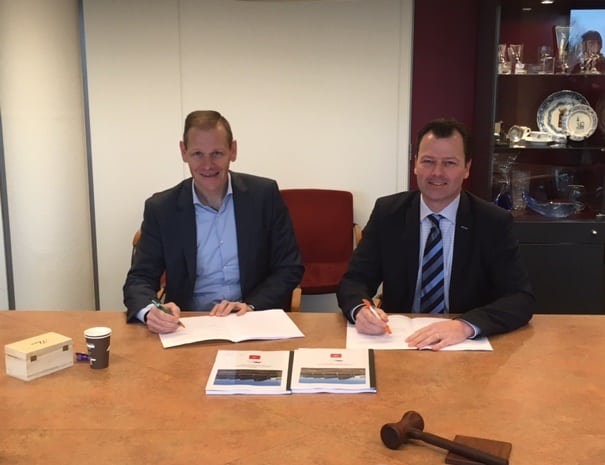 Wethouder Marcel Elferink (rechts op de foto) en Alfred Bolks (AM; links op de foto) ondertekenen overeenkomst