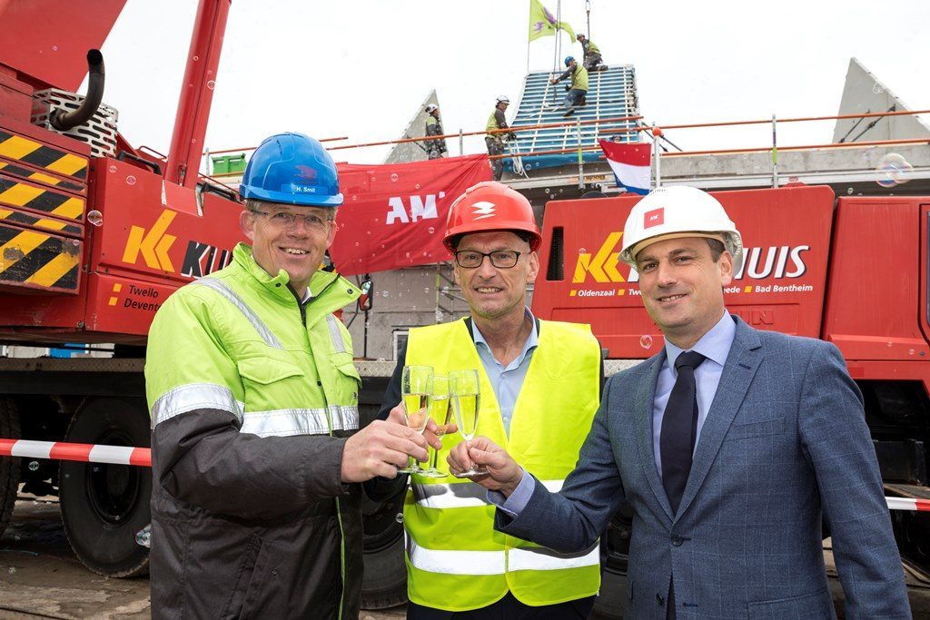 Het vieren van een feestelijk moment als het bereiken van het hoogste punt is niet meer dan normaal volgens directievoorzitter Hans Smit van Koopmans (onderdeel van TBI): “Onze mannen staan hier met weer en wind elke dag op de bouwplaats om dit te realiseren. Daar mogen we best even bij stil staan”. Om het hoogste punt extra luister bij te zetten, overhandigde Peter Heuvelink, namens Y AM Home CV, Daelmans Vastgoed en Koopmans, aan de Stichting Overleven met Alvleesklierkanker een cheque ter waarde van 500 euro.