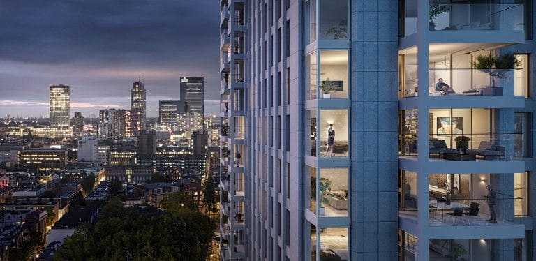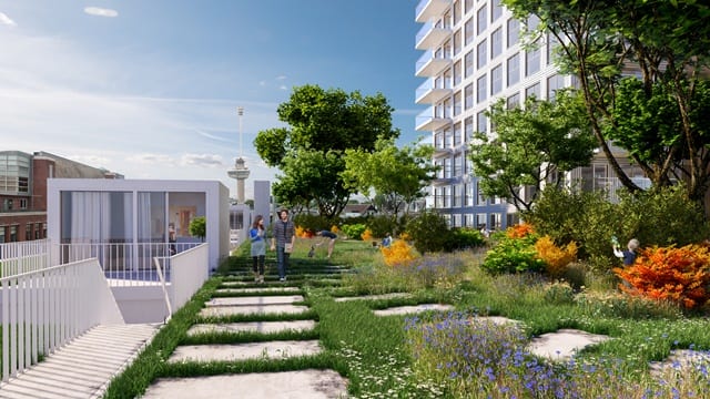 De terrassen en balkons worden aan de straat- en parkzijde gerealiseerd. Dit alles versterkt de levendigheid en beleving van het gebied aan de Houtlaan en de Gedempte Zalmhaven. Daarnaast hebben ook alle appartementen een buitenruimte, met prachtig uitzicht over haven en stad.