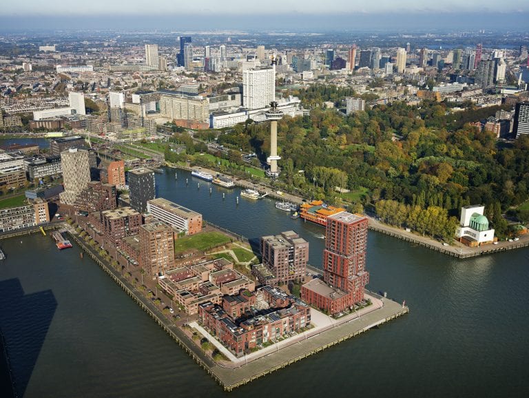 De gebiedsontwikkeling Müllerpier nadert met de realisatie van STACK en nog één ander bouwblok haar afronding. Het is de fraaie afronding van een traject waarmee AM en haar partner als ‘Stad- en gebiedmaker’ een tweede jeugd heeft gegeven aan dit voormalige havengebied, op een landtong tussen de Parkhaven en St Jobshaven. In totaal zijn hier ruim 500 woningen aan de stad toegevoegd, grondgebonden en gestapeld. Het stedenbouwkundig plan van KCAP werkt met gebouwen als autonome objecten die door een zorgvuldige onderlinge plaatsing een stedelijk ensemble vormen. Enkele daarvan werden gedraaid in de richting van stedelijke ‘landmarks’ zoals de Erasmusbrug om zo een verbinding te leggen met de rest van de stad. Door de diepte van de gebouwen zijn er veel semi-openbare hoven en binnenplaatsen die een aanvulling vormen op de openbare ruimte.