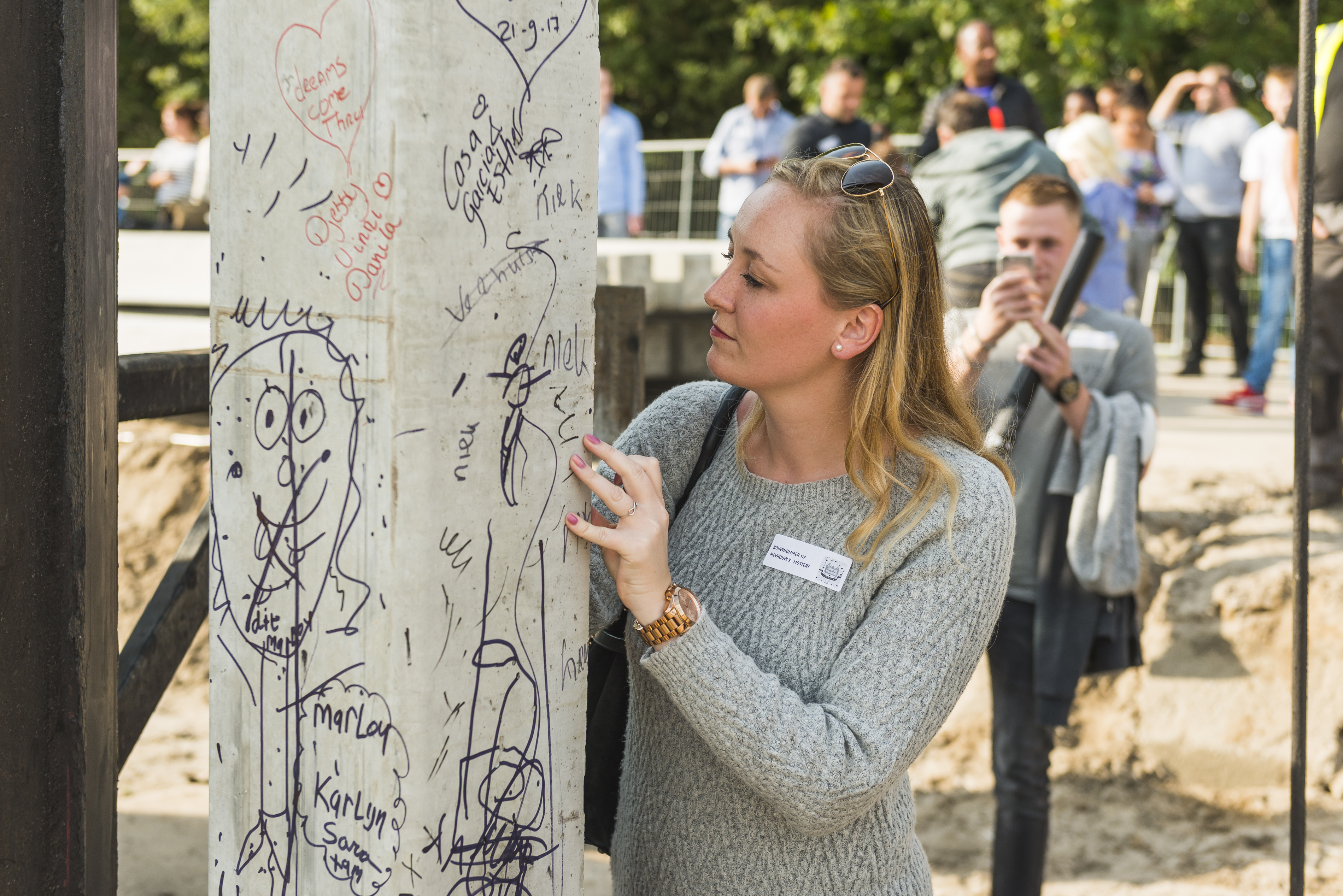 Op de bouwplaats mochten alle kopers een boodschap op de eerste heipaal schrijven. Daarna is door de wethouder en de directie OCM tezamen het startsein gegeven voor de bouw.