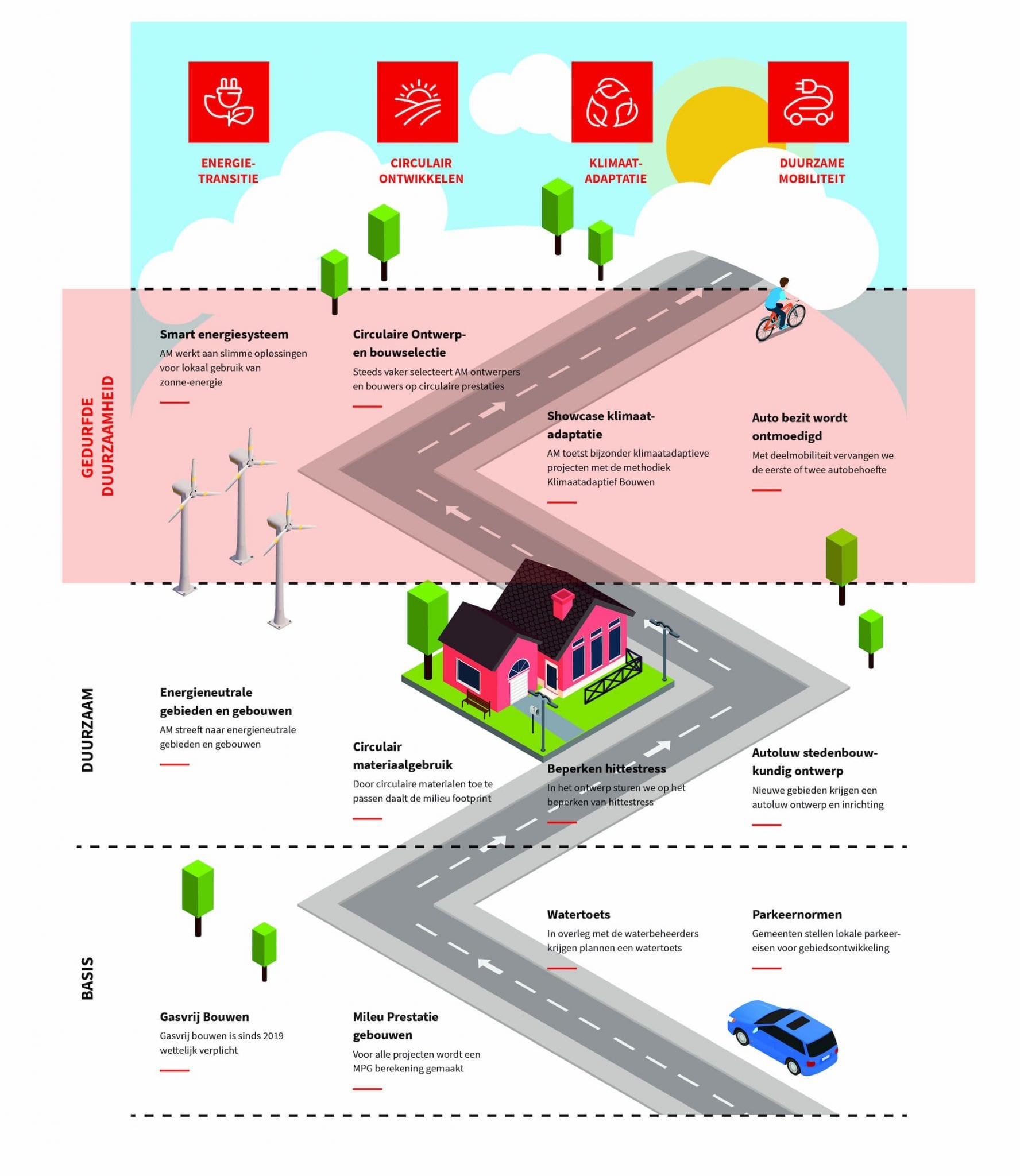 AM heeft duurzaamheid onderdeel gemaakt van haar werkwijze voor gebiedsontwikkeling. Vanuit de strategie ‘Gedurfde Duurzaamheid’ worden voor alle nieuwe projecten duurzame ambities opgesteld. Vervolgens worden mogelijkheden en beperkingen voor duurzame oplossingen geanalyseerd. De ambitie en mogelijkheden vormen de duurzaamheidsvisie voor een gebied. Met partners wordt deze verder uitgewerkt, in samenhang met het ontwerp van de wijk, de doelgroepen, woningtypen, enzovoort. Dit leidt tot een integraal Duurzaamheidsplan, een soort masterplan voor duurzaamheid. In de uitwerking worden de duurzame oplossingen uitgewerkt in de engineering fase, gecommuniceerd richting de klanten en eindgebruikers, gerealiseerd, opgeleverd en na oplevering gemonitord.