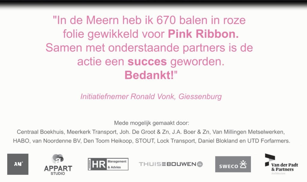 Stichting Pink Ribbon financiert projecten en onderzoeken op het gebied van behandeling, nazorg en lange termijn effecten van borstkanker. Met als doel een beter en langer leven voor de (ex) borstkankerpatiënt. Zie www.pinkribbon.nl.
